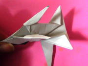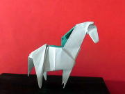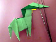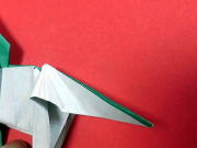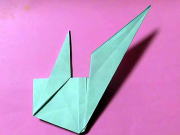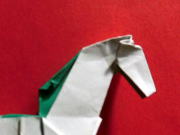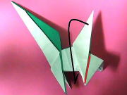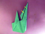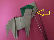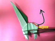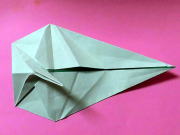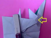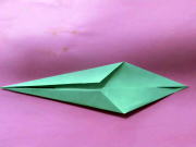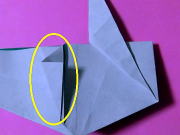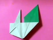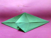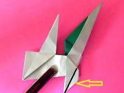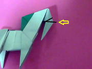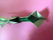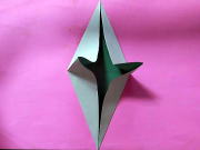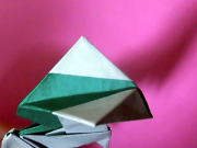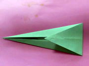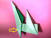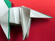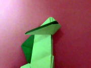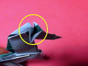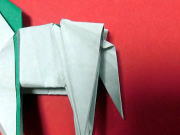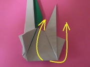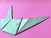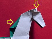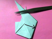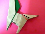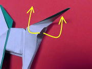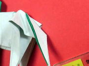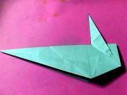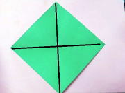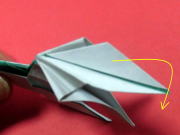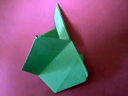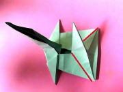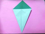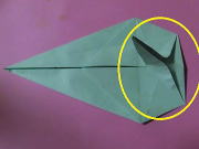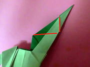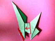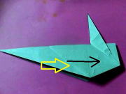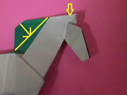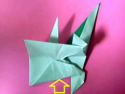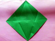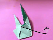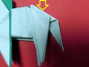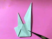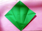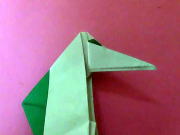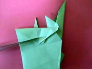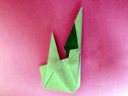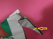 山折リ、耳になります 続けて上辺右角を 少し山折り 緑部分を 2等分谷折りします ![]() |