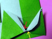 赤矢印の所を押し下げ ながら 同時に 黄色矢印 の所を押し上げ 付けた折り線を⇒ ![]() |
