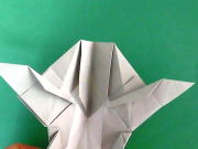 中心から下は 重ねたまま 谷折り 上は 中心から 山折り 更にもう一度⇒ ![]() |