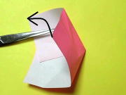 左側の斜め折り線に 谷折りで合わせて赤矢印 部分に折り線を付けます ![]() |
