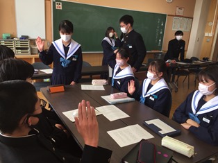 級長と生徒会役員が集まって、今後の生徒会について話し合いました。初めての1年生もいたので、アイスブレイクも入れて、話し合いを充実させました。 |