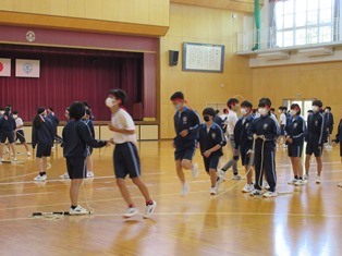 ・・・しかし、あいにくの雨。予定変更して、体育館などを使った練習に代わりました。3年生は8の字跳びの練習をしました。各クラス和気あいあいで練習を進めており、良い雰囲気でした。 |
