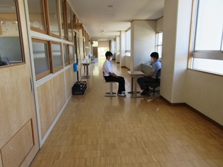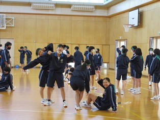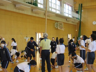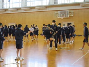 残念ながら、体育祭は明日に延期。天気は良くなったのですが、グラウンドの水はけが悪く、生徒のみんなが思い切って頑張れる状態ではないと判断しました。明日、万全の状態で、青春の1ページをつくりあげて欲しいと思います。4時間目、1年生は体育館で玉入れの練習、3年生は教育相談の時間として使っていました。 |