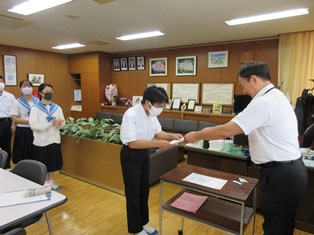 三丘賞の表彰の様子です。今日は3年3組のメンバー6名が校長先生から賞状をもらいました。 |