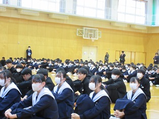 冬休み明けの全校集会が行われました。今日は集合から素晴らしい雰囲気で始まりました。2年生が先に全員揃い、厳粛な雰囲気で開始を待つことができました。新年にかける意気込みが感じられました。3年生も同様に入場し、新年に相応しい式を皆でつくりあげました。 |
