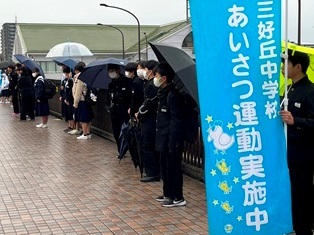 生徒会主催の地域あいさつ運動が行われました。あいにくの天気でしたが、自主的に参加してくれた生徒は実に130名。(丘中前6名、駅前31名、三好丘小50名、黒笹小43名)「あいさつを交わすのは、やっぱりいいな。」を地域に広げたいと思って集まってくれた仲間です。ぜひ、また計画をしてほしいと思います。 |