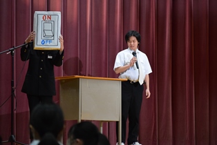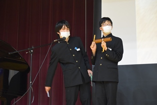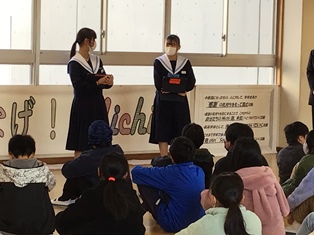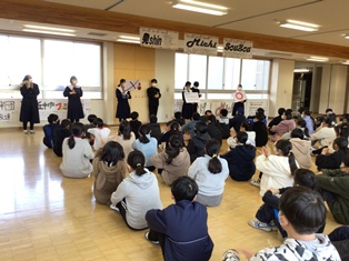 入学説明会の「教えて先輩!」。1年生が小6の児童に説明会をしています。 | ||